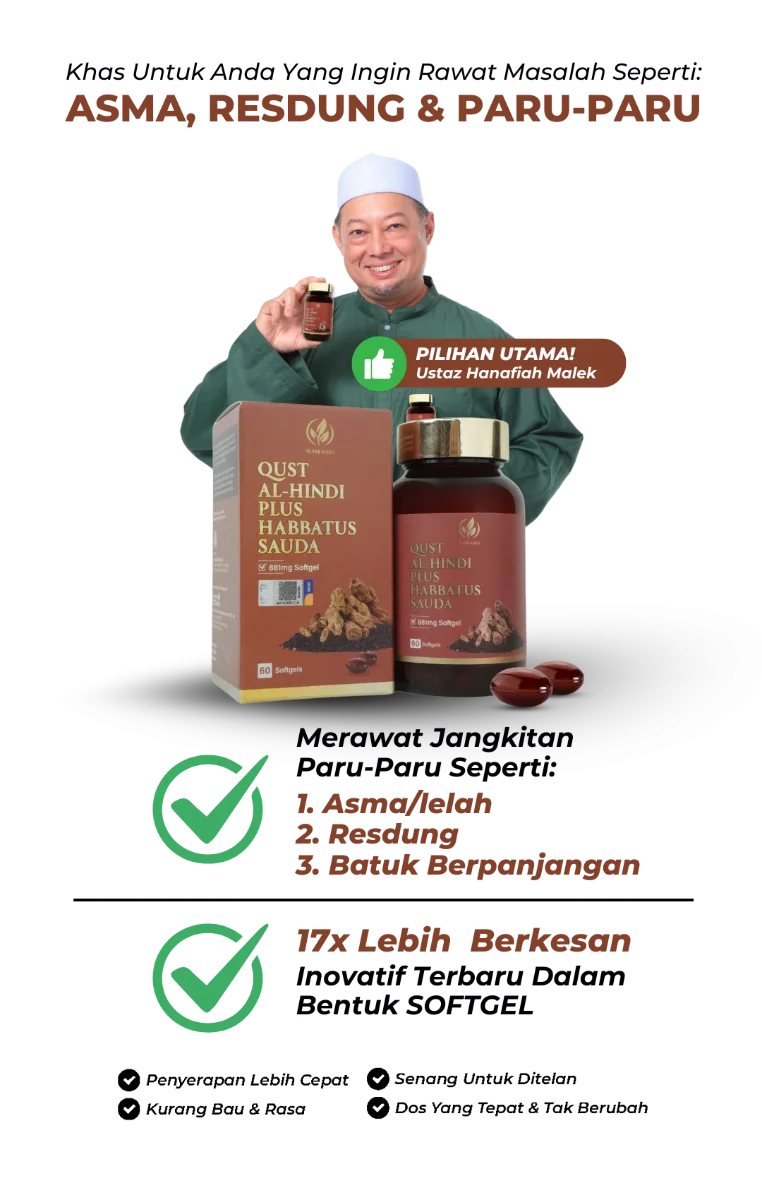 Terapi Softgel Qust Al-Hindi Premium diformulasikan khas untuk merawat masalah pernafasan kronik dari peringkat akar umbi. Ia bertindak pantas mematikan radang yang menyebabkan bengkak pada tiub pernafasan anda.